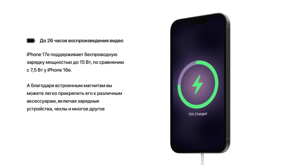 Главное изменение для тех, кто переходит с предыдущей модели, — появление MagSafe. iPhone 16e поддерживал только Qi со скоростью 7,5 Вт. iPhone 17e заряжается по MagSafe на скорости до 15 Вт — вдвое быстрее. Магнитное крепление открывает доступ к полной экосистеме аксессуаров: кошельки, чехлы, держатели, внешние батареи — всё с моментальной фиксацией.
