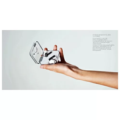 Наушники Nothing Ear способны проработать от одной полной зарядки до 8,5 часов (при выключенном шумоподавлении), а общее время с учётом подзарядок от кейса составляет ещё более внушительные 40,5 часов или 24 часа при постоянном использовании активного шумоподавления. Наушники можно заряжать как беспроводным, так и проводным способом. В последнем случае доступен "быстрый режим", с которым всего 10 минут проводной зарядки хватит на 10 часов прослушивания.