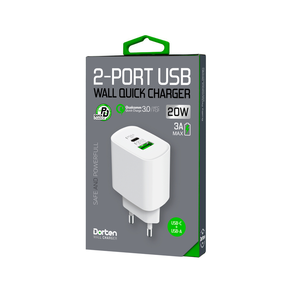 Сетевое зарядное устройство Dorten 2-Port USB 20W Wall Quick Charger PD3.0+QC3.0, белый