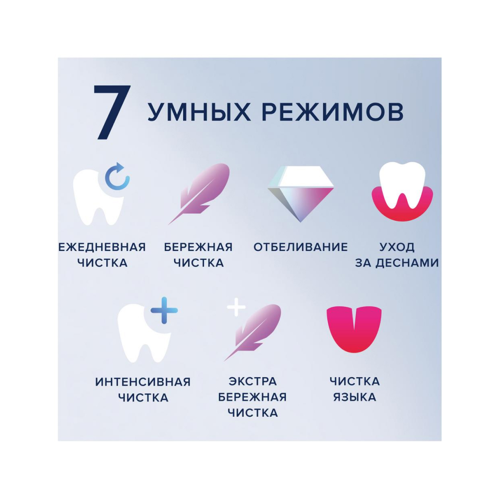 3D-отслеживание с искусственным интеллектом распознает чистку трех типов поверхностей зубов, обеспечивая наиболее тщательное очищение.